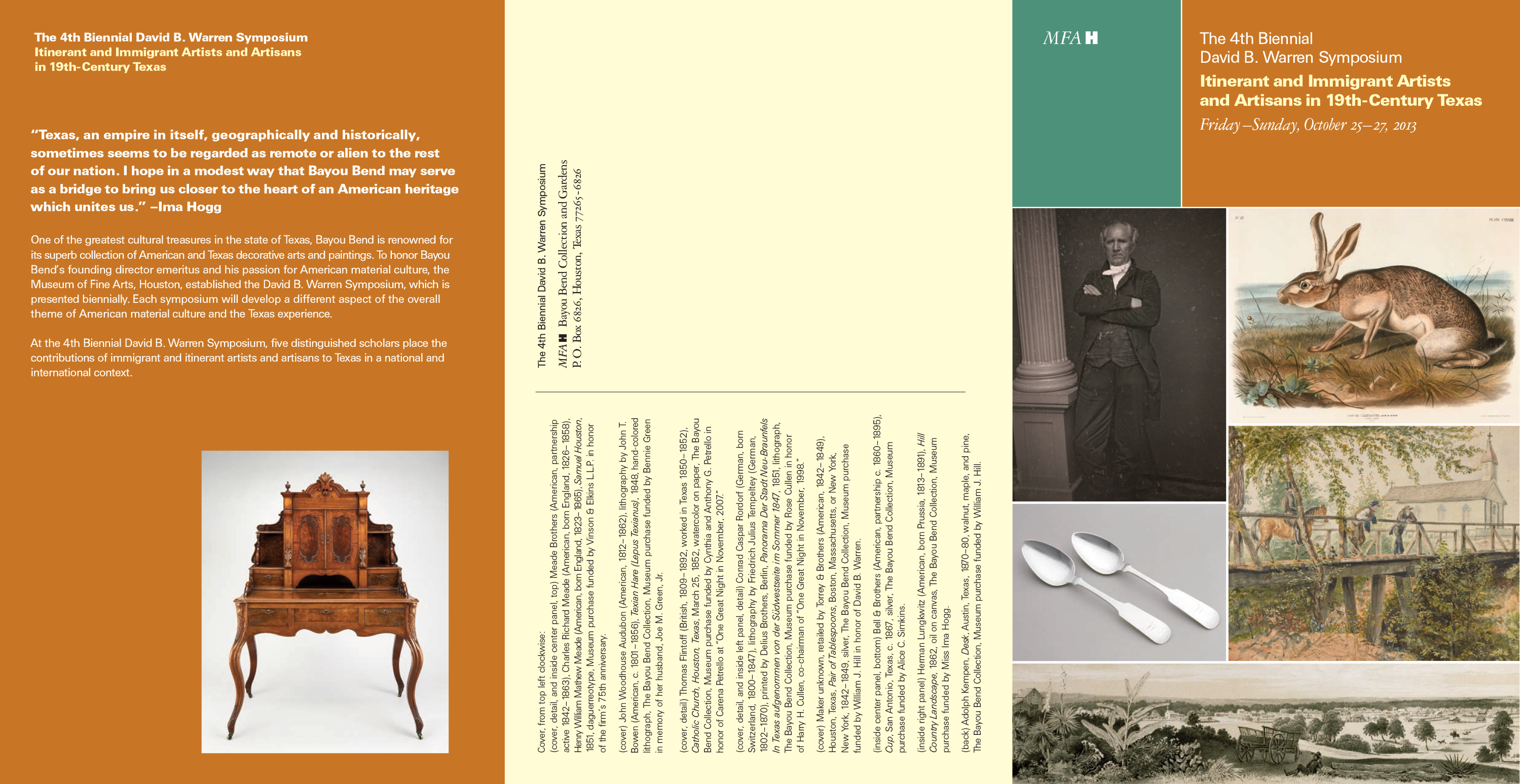 The Bayou Bend Collection and Gardens at the Museum of Fine Arts, Houston is renowned for its superb collection of American decorative arts and paintings. The biennial David B. Warren Symposium addresses different aspects of the theme, “American Material Culture and the Texas Experience.” This program card was designed for that year’s theme using the colors and branding of Bayou Bend and the MFAH that focusing on itinerant immigrant artists and artisans in 19th century Texas. It featured select pieces from the collection of Bayou Bend and a schedule of events with speaker information and talks.