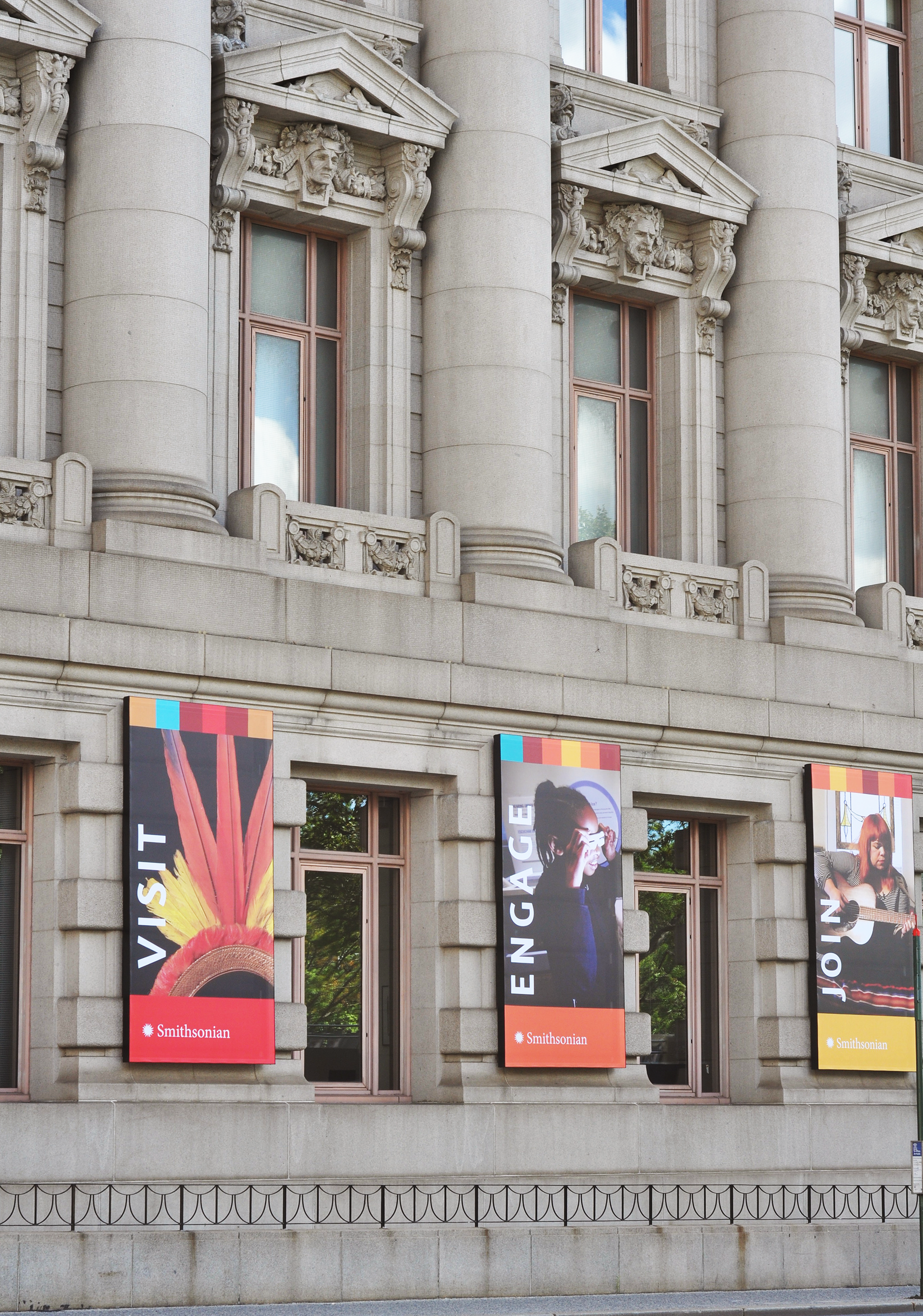 Series of large-scale banners designed for the Smithsonian National Museum of the American Indian’s exterior signage promoting the museum and featuring its many rich experiences. Located at the historic Alexander Hamilton U.S. Custom House in Lower Manhattan, these banners were designed to attract visitors amidst the heavy foot traffic in the adjacent Battery Park and Statue of Liberty ferry landing. Through imagery, color and text that reflected the types of experiences you can have at the museum the banners are designed to be interchangeable and can be easily updated for new and upcoming exhibitions while incorporating the new branding of the NMAI.